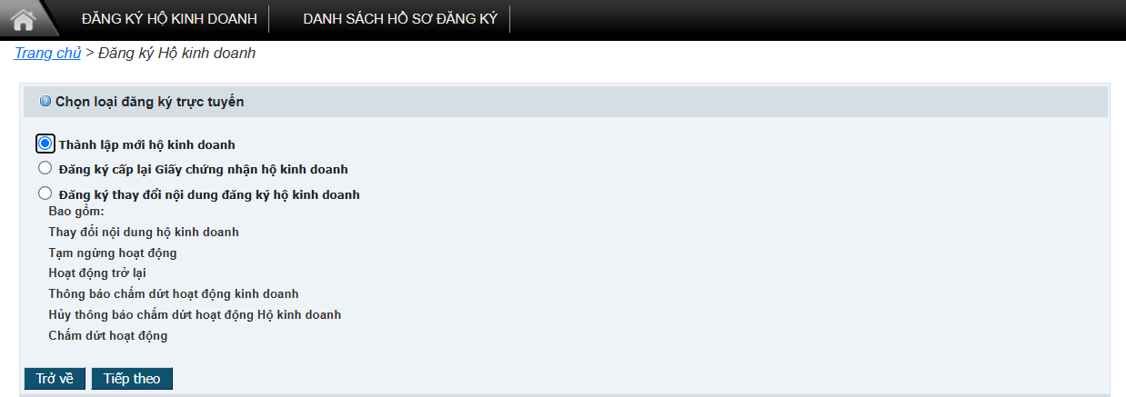 - Bước 3 – Chọn mục đăng ký hộ kinh doanh