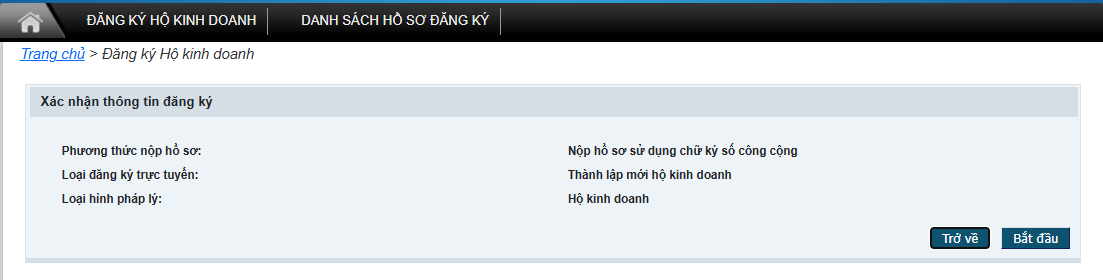 + Điền loại hình đăng ký, sau đó chọn “Bắt đầu” để tiếp tục.